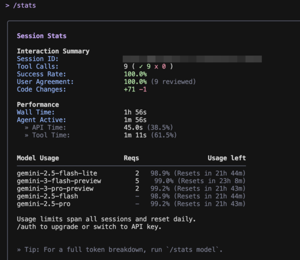 個人で「Gemini AI Pro」を年額/月額課金している場合や、法人プランを利用している場合、無料枠よりも高いリクエスト上限(クォータ)が適用されます。/stats コマンドで現在の利用状況を確認してみましょう。