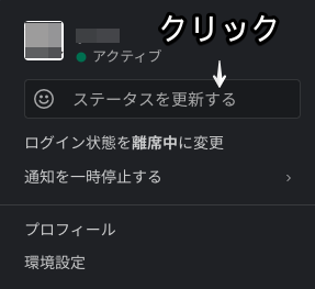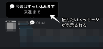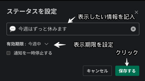 技術 slack [slack]ステータスにメッセージを設定する PR 2022-11-07 2022-11-07 slackのアイコンの横に簡易なメッセージを設定して表示させる方法 スポンサーリンク slackの右上の自分のアイコンをクリックする ステータスを更新するをクリック スポンサーリンク 表示したい情報を記入し有効期限を設定 伝えたいメッセージが表示される この記事が気に入ったら『目黒で働く分析担当の作業メモ』にご支援をお願いします! ※OFUSEに飛びます