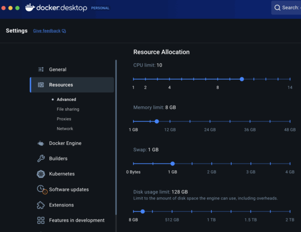 また、Docker Desktop自体のディスク割り当てが上限に達している可能性もあります。その場合は、Docker Desktopの Settings > Resources > Disk usage limit の設定値を大きくしてみてください。